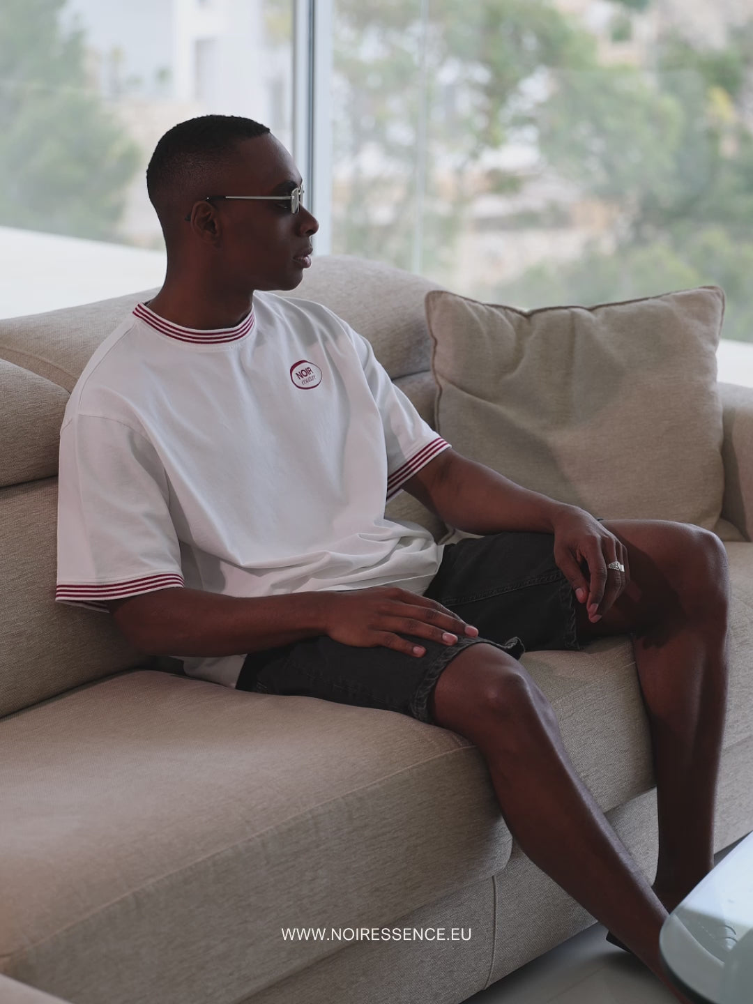 Oversize, slightly cropped T-shirt with dropped shoulders in White and red strips in neck and sleeves, with “Couture” design printed on the front of the T-shirt.
